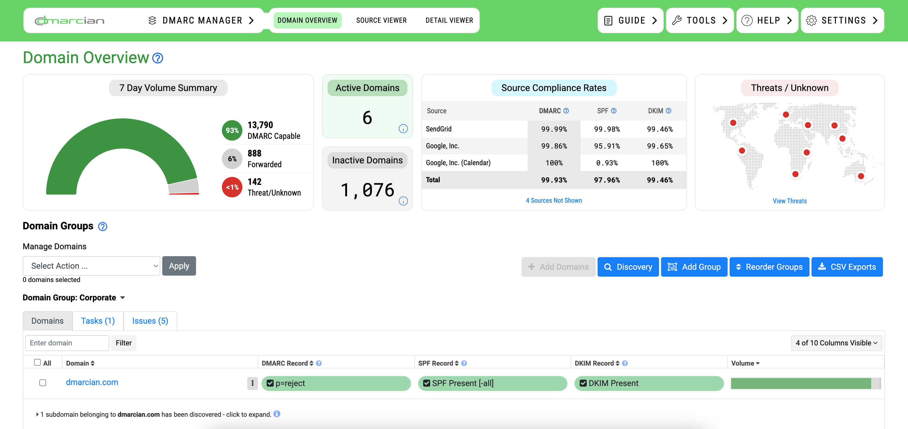 Dmarcian places a strong emphasis on DMARC data enrichment and providing excellent visibility into your sending sources. Their platform excels at aggregating various DMARC reports, both RUA and RUF, and presenting them in a structured, actionable format. We find its detailed source identification, which goes beyond just IP addresses to include hostnames and service providers, to be particularly insightful.
