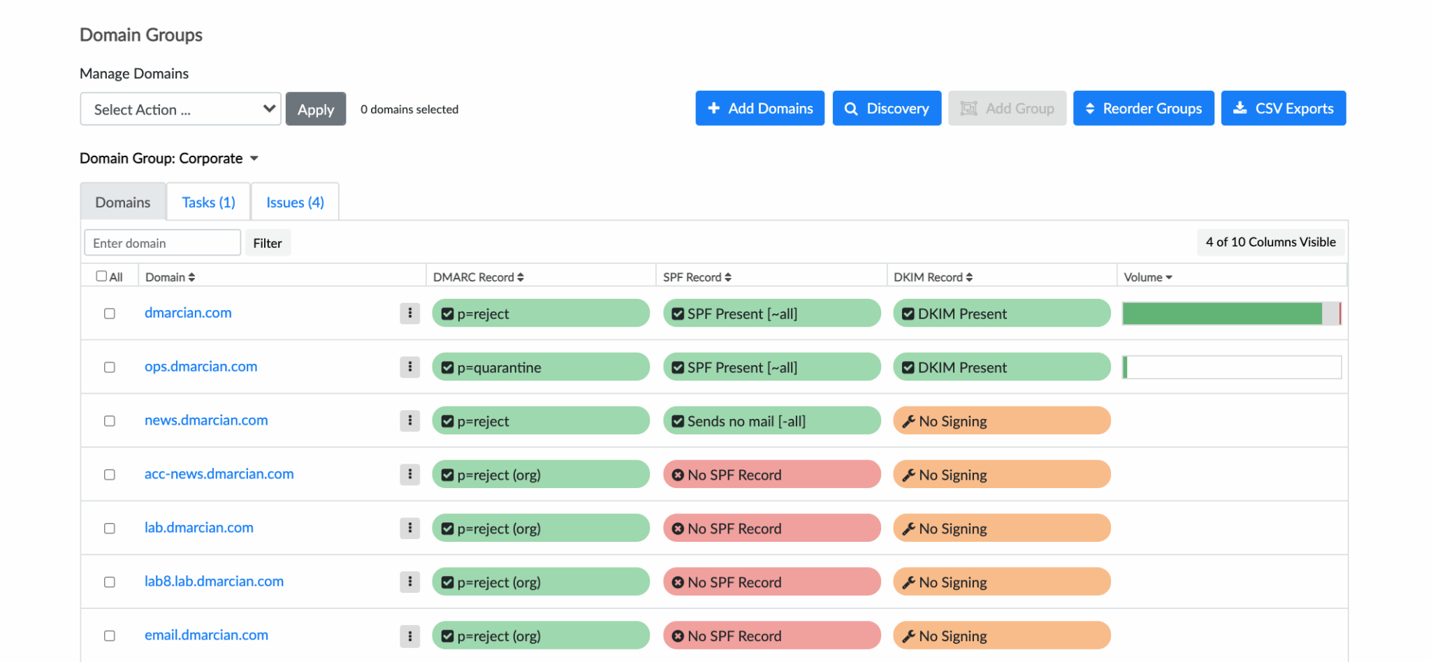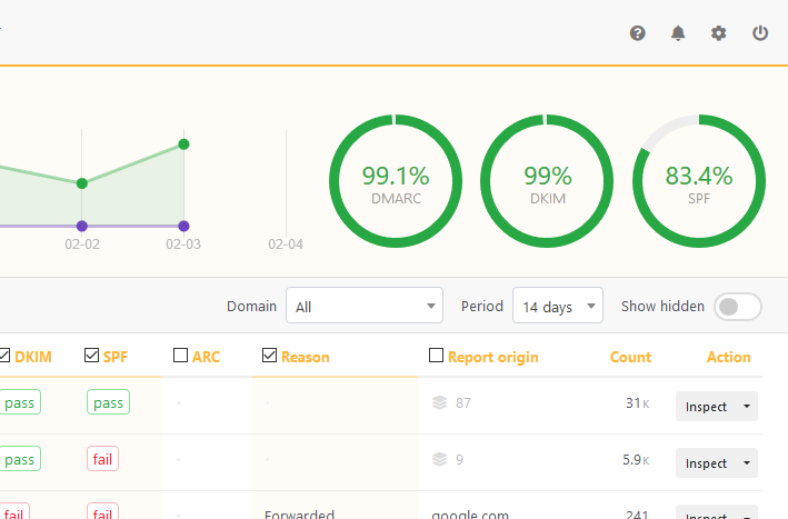 Their interface provides a comprehensive overview, with intuitive filtering and search capabilities that make it easy to drill down into specific data points. We appreciate the integrated tools for validating and optimizing SPF, DKIM, DMARC, and MTA-STS records, ensuring all aspects of email authentication are covered from a single dashboard.