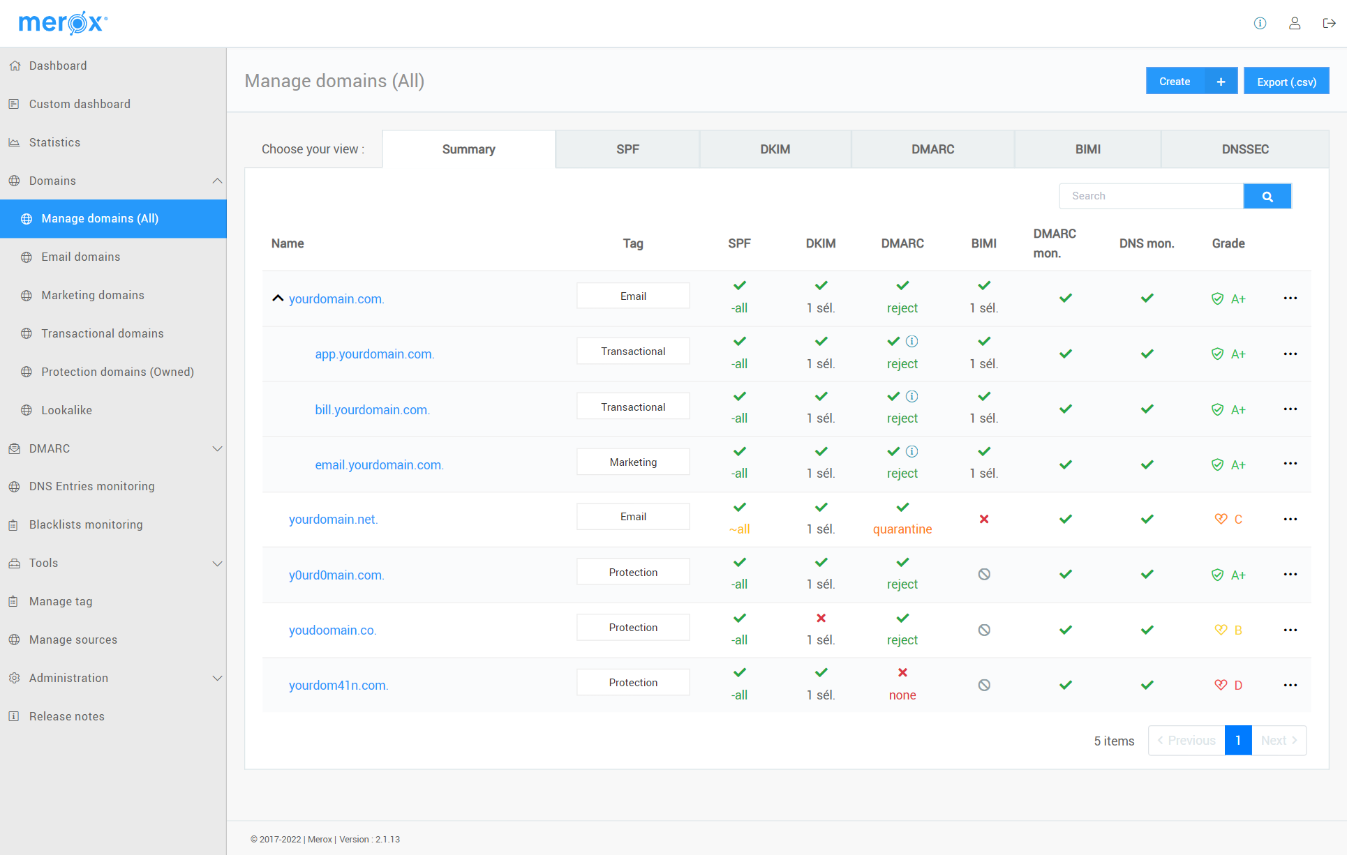 Merox provides in-depth DMARC reports, offering granular visibility into email authentication results across SPF, DKIM, and DMARC. We found its dashboard effective for identifying email sources and understanding authentication failures.